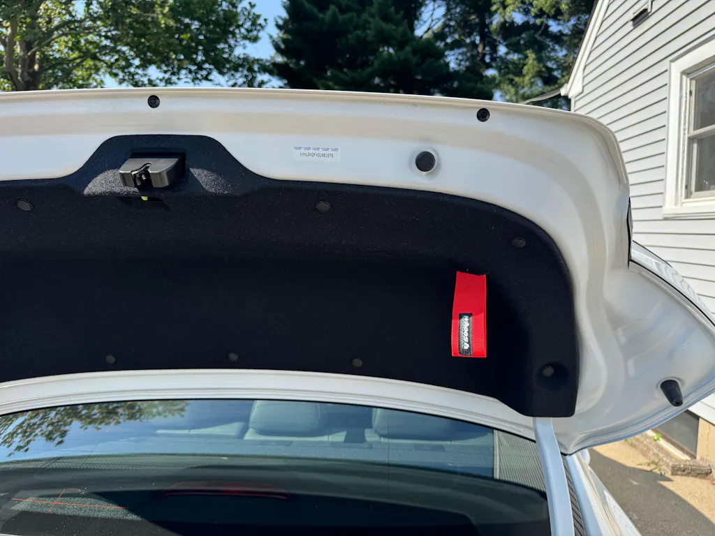 The whoosh motorsports Trunk Pull Strap installs easily using a factory attachment bolt under the trunk lid liner. Match the supplied template to the 2 upper right side plastic push pins then cut a small slit in the trunk liner to push the strap through.